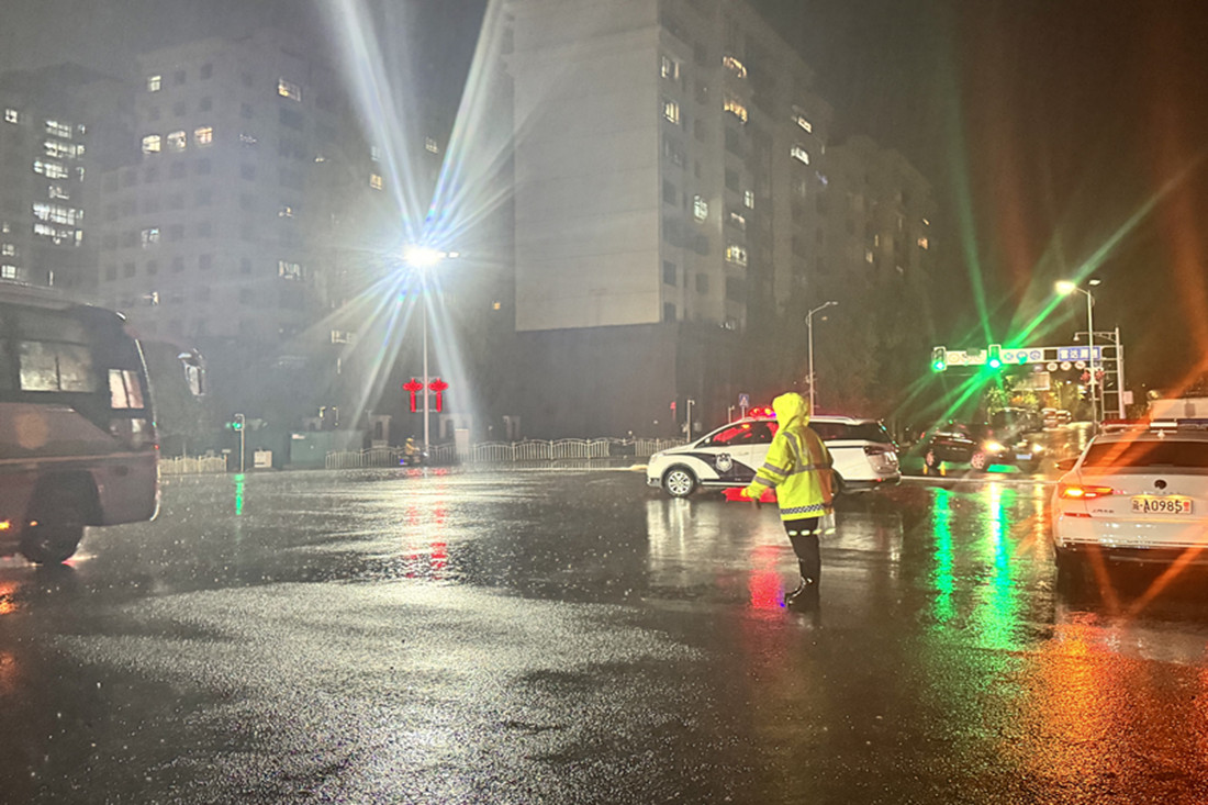 工作中,民警积极联合消防救援大队出警人员,采取清理路面垃圾、清扫道路淤泥等措施,及时消除了积水安全隐患,同时,对车流量较大、易拥堵路段、重点部位明确专人负责值守,为引导车辆安全有序通过,民警站在雨中,通过指挥手势、口哨等方式指挥道路交通。