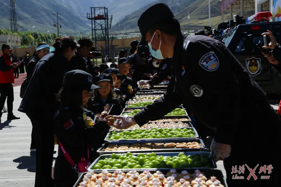 活动尾声,拉萨特警为师生们精心准备了丰盛的点心,供师生们品尝。同时,孩子们也为特警队员献上手工画卷、手绘心中警营,用稚嫩笔触描绘心目中的“警察英雄”,向特警叔叔献上最纯真的爱。幼儿们激动地说:“我长大也要当特警,保护大家!”