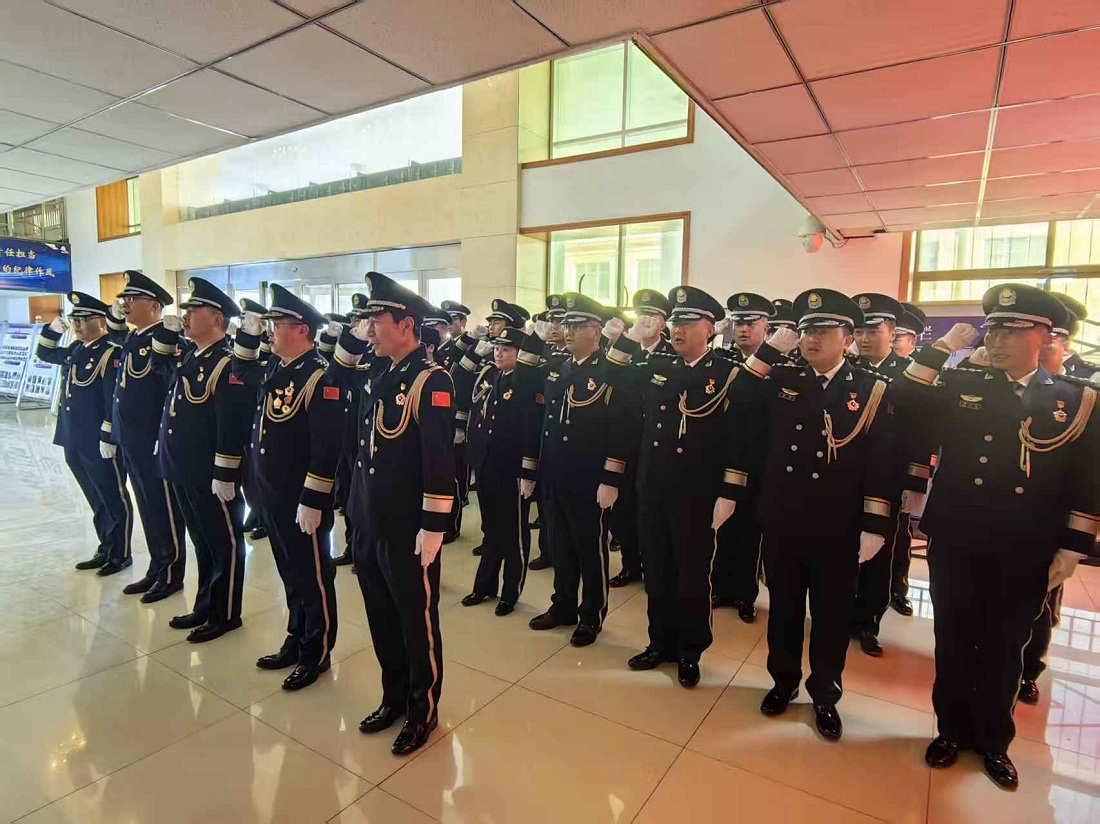 活动以庄重的仪式教育拉开序幕。伴随着激昂的《中国人民警察警歌》,警旗冉冉升起,全体民警警容严整、肃立致敬,深切感悟警旗赋予的使命与荣光。在领誓人的带领下,民警们高举右拳,面向警旗庄严宣誓,铮铮誓言铿锵有力、响彻全场,既是对从警初心的回溯,更是对职责使命的郑重承诺。仪式现场还举行了党建书籍发放仪式,进一步强化全警理论武装,筑牢政治忠诚根基,随后全体人员合影留念,定格这一意义非凡的时刻。