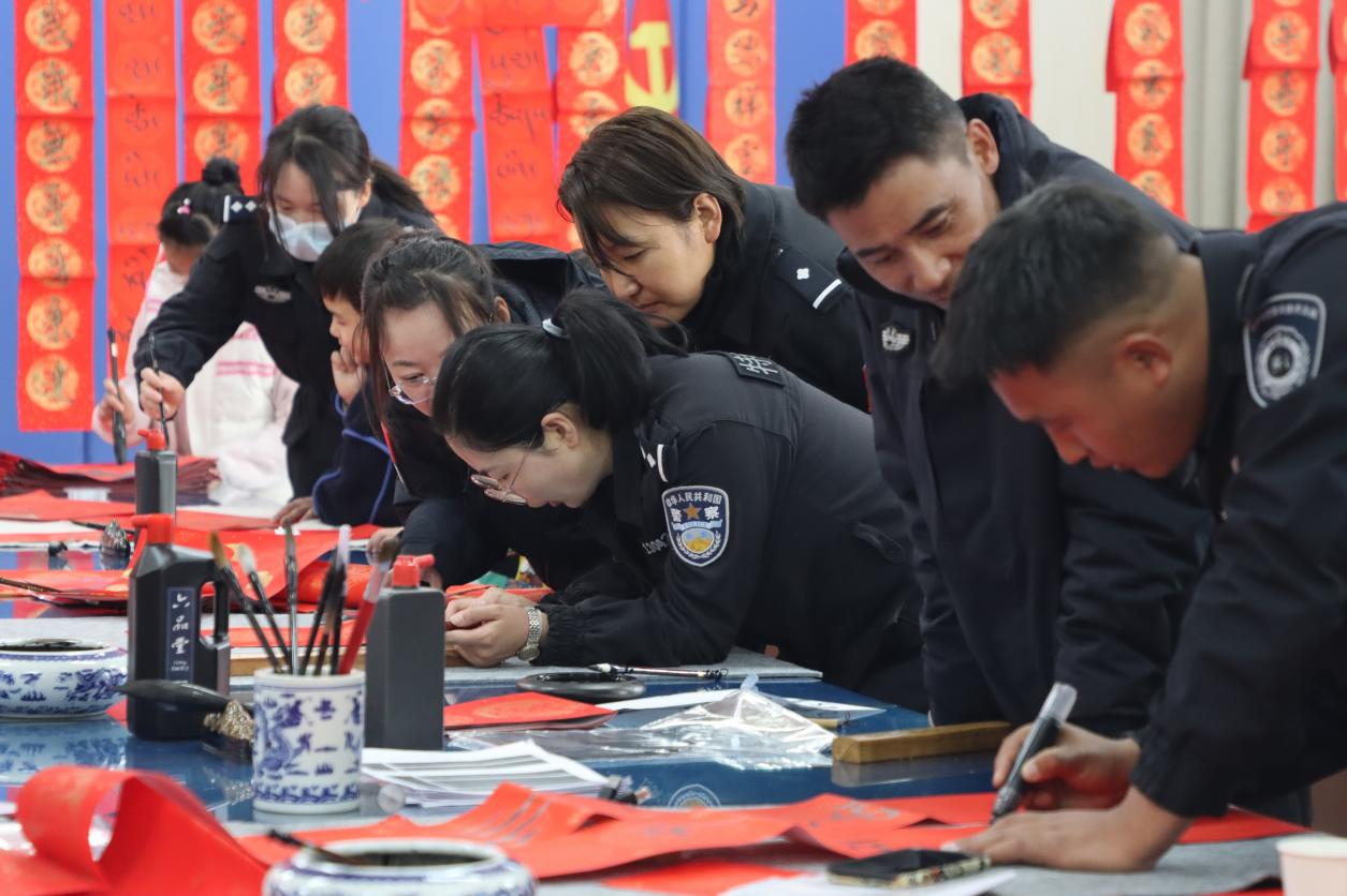 此次活动历时2小时,警营书法家及书法爱好者共创作春联400余副、“福”字500余张,为警营增添了浓郁的节日色彩。