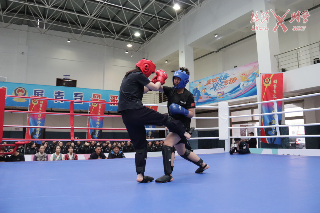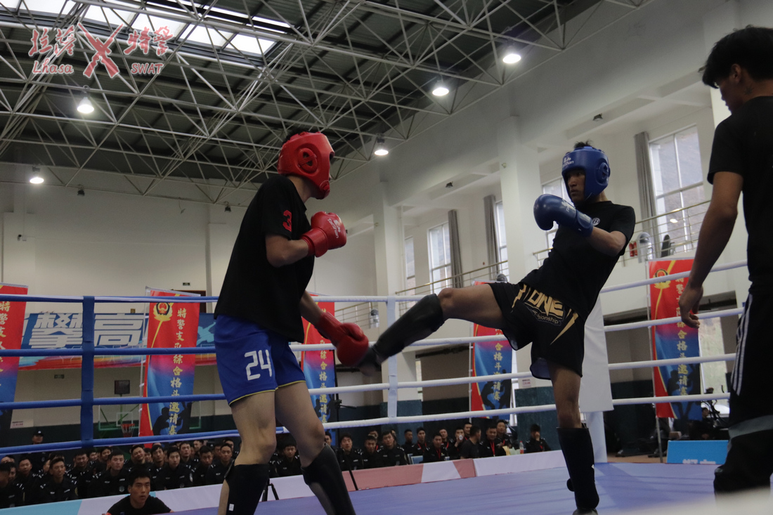 随着巴桑多吉同志一声令下,来自特警支队、城关公安(分)局的27名民警同场竞技、一决高下,综合格斗邀请赛正式打响。在观众的呐喊声中比赛激情上演,红蓝双方队员迅速进入状态,拳腿组合凌厉、动作干净利落,充分展示了公安民警过硬的体能素质和精湛的格斗技巧,以及忠诚担当、敢打必胜的拼搏精神和良好形象。