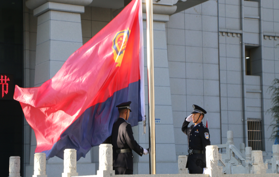 上午10时,参加仪式的民辅警英姿挺拔、精神抖擞,在升旗台前整齐列队。伴随着响亮的《中国人民警察警歌》响起,警旗迎着晨曦和朝阳冉冉升起,全体人员肃立目视警旗庄严敬礼。